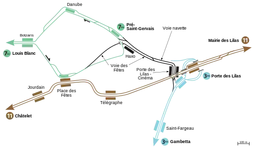 Проект по соединению 3 и 7 линий (тогда они еще не назывались 3bis и 7bis) между станциями Порт де Лила и Пре Сен-Жерве (Pré Saint-Gervais) был задуман еще в начале XX века и поддерживался муниципалитетом, которому принадлежала железнодорожная сеть. Компания железных дорог парижского метро (фр. Compagnie du chemin de fer métropolitain de Paris; CMP), эксплуатировавшая пути, выступала против проекта из-за его низкой рентабельности. Тем не менее, два одноколейных туннеля — путь де Фет от Place des Fetes к Porte des Lilas с промежуточной станцией Нахо, и «челночный путь» (voie navette) в обратном направлении без промежуточной станции — были сооружены. Однако в эксплуатацию было решено ввести лишь «челночный путь». Поезда ходили по нему с 1921 по 1939, но после войны движение по отрезку было решено не возобновлять, так как к тому времени 11 линия уже соединила Place de Fetes и Porte des Lilas. Правда, в 1952-56г. «челночный путь» стал доступен для пассажиров, хотя и в ограниченном режиме: здесь проходили испытания первого пневматического подвижного состава МР-51 и системы автоведения. Нередко пассажирам, особенно детям, даже разрешали сесть в кабину машиниста и «управлять» поездом. Тем не менее, в регулярную коммерческую эксплуатацию отрезок введен не был. Что же касается станции Аксо, то она так никогда и не была введена в эксплуатацию и даже не имеет выходов.