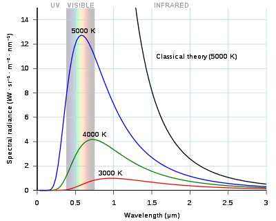 Согласно классической термодинамике спектральная интенсивность I(ν) излучения должна быть одинаковой для любых абсолютно чёрных тел, нагретых до одинаковой температуры. Такое предсказание подтверждается экспериментом. Спектральная интенсивность достигает максимума при некоторой частоте νmax, а по обе стороны от максимума падает до нуля. Частота максимума νmax, как и его высота, увеличивается с температурой.