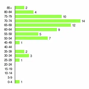 | Жителей | 434 | 659 | 527 | 444 | 271 | 185 | 121 | 99 | 71 |