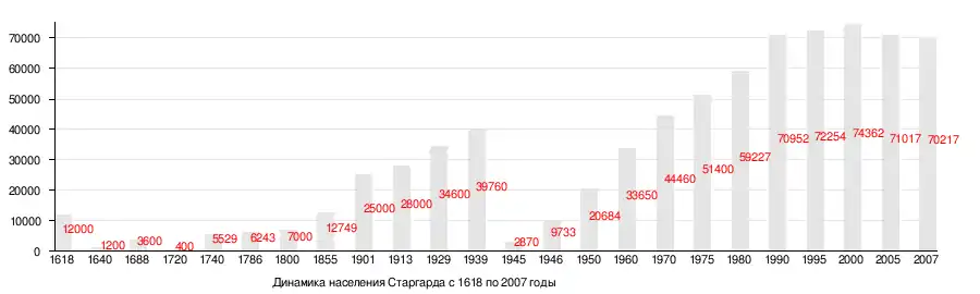 Прирост населения Старгарде в течение веков был неровным. Свой вклад сделали многочисленные войны, стихийные бедствия и эпидемии.