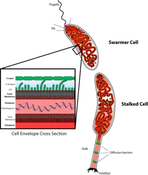 Наиболее отчётливо бактериальное старение проявляется у Caulobacter crescentus, у которой оно впервые было описано. В начале жизненного цикла бактерия представляет собой подвижную клетку. Когда она находит подходящий субстрат, она оседает на него, превращаясь в неподвижную клетку-стебелёк. Клетка-стебелёк начинает делиться, отделяя новые подвижные клетки. Однако со временем новых клеток образуется всё меньше[1], что можно рассматривать как признак старения[8].