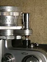 - Штатный объектив — «Гелиос-44» 2/58 мм с механизмом нажимной диафрагмы: при нажатии на спусковую кнопку она закрывается до рабочего значения. Кнопка диафрагмы, размещённая на оправе объектива, сопряжена со спусковой на передней стенке камеры по типу фотоаппаратов Exakta, Topcon, Alpa и Miranda[10];
