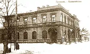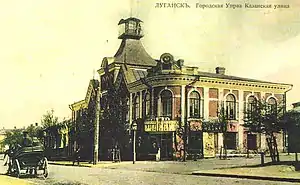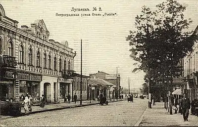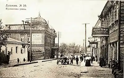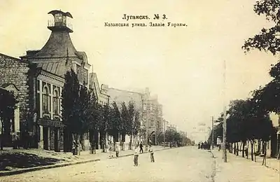 | Казанская | Сформировалась во второй половине XIX века. Названа в честь Казанской церкви, построенной в 1864 году.[5] В архитектуре преобладал стиль модерн. На улице находилась городская управа (теперь Музей истории и культуры Луганска). Во дворе дома находилась пожарная часть. Первый этаж занимал магазин Браславского, который торговал велосипедами и граммофонами. До сих сохранилось здание Азовско-Донского Банка. На улице некоторые здания принадлежали евреям. В одном из них функционировала Амбулатория общественной помощи бедным евреям. Издавалась газета «Южный Израиль». На Казанской содержались гастрономические и колбасные магазины, салоны и различные магазины.