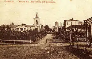 | Успенская молебня | Первая церковь Луганска. Возведена в 1821 году на Старобазарной (Успенской) площади. Сгорела у 1830 году. В течение 1840—1854 годов построили каменную молельню. В 1910-е годы планировалось возведение новой церкви, но с установлением советской власти проект не был реализован | 1924 год | ![]() Успенская церковь и сквер. Церковь разрушена в 1924 году. Теперь сквер Революции (Луганск). |