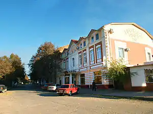 | Пушкина | Проектный институт «Гипрошахт», 1944 г. (№ 1), горно-коммерческий клуб, 1949 г. (№ 2), Гостиница «Октябрь», 1944—1951 гг. | ![]() Отель «Украина» в Луганске | пл. Красная | Дом Техники (1953), построенный на месте разрушенного Николаевского собора | ![]() Луганский дом техники. |