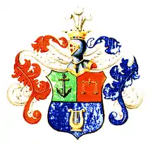 Щит полурассечён и пересечён. В верхней правой зелёной части чёрный якорь с анкерштоком. В верхней левой червлёной части золотые весы. Внизу в лазоревом поле вертикально золотая лира.