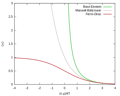 - Для частиц с полуцелым спином числа заполнений могут принимать только два значения: 0 и 1. Частицы в этой категории, называемые фермионами, подчиняются статистике Ферми — Дирака.