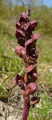 Цветки в густом колосовидном соцветии. Три наружных листочка околоцветника срослись в красно-зелёный шлем, боковые листочки внутреннего круга узколинейные, небольшие. Губа тёмно-бурой окраски, с раздвоенным шпорцем на конце. Прицветники маленькие, лиловатые.