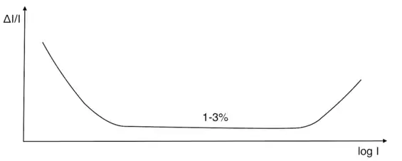 - чувствительность к изменению яркости Как видно из рисунка, для среднего диапазона яркости контраст (а с ним и различимость глазом) примерно постоянен и принимает минимальное значение, тогда как для малых и больших яркостей значение порога различимости возрастает. Для средних значений яркости человеческий глаз воспринимает неоднородность изображения, когда относительное изменение яркости превышает 1—3 %. Однако результаты новейших исследований показывают, что при малых значениях яркости порог различимости увеличивается, то есть человеческий глаз более чувствителен к шуму при низкой интенсивности света.