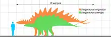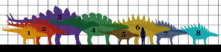 Стегозавры были крупнейшими представителями своего инфраотряда, включавшего также роды Kentrosaurus и Huayangosaurus. Их максимальная длина составляла 9 метров (S. armatus), высота — 4 метра. Грегори Пол оценил длину вида stegosaurus ungulatus в 7 м и вес в 3,8 тонн.[3]Мозг динозавра был не больше, чем у собаки: при весе животного в 2 тонны его мозг весил лишь 70 граммов[4][5]