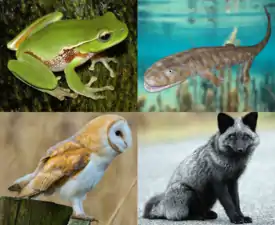 ![]() Сверху: зелёная литория, акантостега; Снизу: обыкновенная сипуха, обыкновенная лисица | ||||||