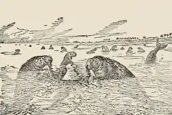 Мы ловили их, пользуясь большим железным крюком, наконечник которого напоминал лапу якоря; другой его конец мы прикрепляли с помощью железного кольца к очень длинному и крепкому канату, который тащили с берега тридцать человек... Загарпунив морскую корову, моряки старались сразу же отплыть в сторону, чтобы раненое животное не опрокинуло или не разломало ударами мощного хвоста их лодку. После этого люди, оставшиеся на берегу, принимались натягивать канат и настойчиво тащить к берегу отчаянно сопротивлявшееся животное. Люди в лодке тем временем подгоняли животное с помощью другого каната и изнуряли его постоянными ударами, до тех пор, пока оно, выбившись из сил и совершенно неподвижное, не вытаскивалось на берег, где ему уже наносили удары штыками, ножами и другими орудиями. Иногда большие куски отрезались от живого животного и она, сопротивляясь, с такой силой била по земле хвостом и плавниками, что от тела даже отваливались куски кожи... Из ран, нанесённых в задней части туловища, кровь струилась ручьём. Когда раненое животное находилось под водой, кровь не фонтанировала, но стоило ему высунуть голову, чтобы схватить глоток воздуха, как поток крови возобновлялся с прежней силой...[15]