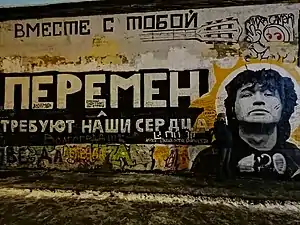 ![]() Стена Цоя, покрытая граффити, плакатами и надписями, 2021 год | |