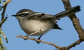 Тело длиной 11—12 см. Спина, шея и верх головы серые. От клюва через глаз проходит чёрная полоса в виде маски. Над ней есть белая надбровная полоса. Крылья чёрные с длинной белой полосой, а длинный чёрный хвост имеет белые стороны. Горло белое. Грудь светло-серая. Брюхо белое с розовым оттенком. Клюв короткий, но крепкий, чёрный.
