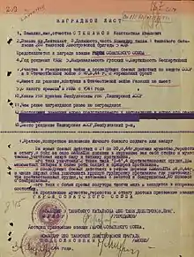«За время боевых действий с 21 по 30 августа 1944 г. проявил мужество, геройство и отвагу. В боях за село Войнешти, попав в окружение, вел себя стойко и мужественно, уничтожая живую силу и технику противника. Его танк уничтожил: 2 танка типа Т-4, 4 противотанковых орудия, две миномётные батареи и более роты солдат и офицеров противника. В последующих боевых действиях в районе деревни Каменешти 24 августа 1944 г. в числе первых вступил в бой с крупной группировкой противника; уничтожил: три противотанковых орудия, 12 автомашин с пехотой и боеприпасами, 40 повозок с боеприпасами…».