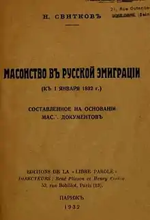 - Свитков Н. Масонство в русской эмиграции (к 1 января 1932 г.) — Париж: Edition de la «Libre parole», 1932.
