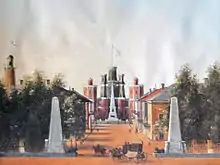 К югу от дома были поставлены два белокаменных обелиска с металлической оградой, отмечавшие границу парадного двора и оформлявшие главный въезд на парадный двор перед домом. По центральной оси въезда на парадный двор, в южной части парка, прямо перед главным домом, воздвигли третий обелиск — в честь Александра I.