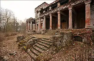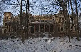 Существующий ансамбль усадьбы с парком создан окончательно в 1895—1900 гг. на средства Елизаветы Платоновны по проекту Василия Александровича Ярошенко[9]. В настоящее время усадьба включает в себя главный дом, хозяйственные постройки, усадебный парк и въездные ворота с фигурами оленей.