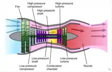 Ещё одно преимущество турбовентиляторного двигателя перед реактивными двигателями с малой степенью двухконтурности заключается в том, что холодный воздух из внешнего контура, смешиваясь с горячими газами из турбины, снижает давление на выходе из сопла. Это способствует снижению шумности двигателя[2].