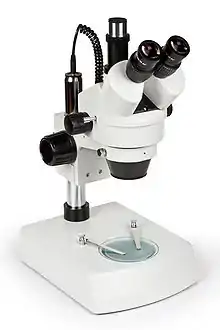 Стереомикро́скоп, бинокуляр (от стерео, греч. στερεός — твёрдый, пространственный) — микроскоп для рассматривания предметов с объёмным их восприятием. Изображения предмета образуют стереопару, что обеспечивает передачу объектов в соответствии с тем, как их раздельно видит правый и левый глаз человека. Стереомикроскопы обычно обеспечивают смену увеличений — большинство современных стереомикроскопов имеют панкратическую (zoom), либо ступенчатую систему Галилея, в упрощенных микроскопах данная система может отсутствовать. Существуют две основные оптические схемы стереомикроскопов — схема Аббе и схема Грену[1]. Стереомикроскоп может быть аналоговым или цифровым.