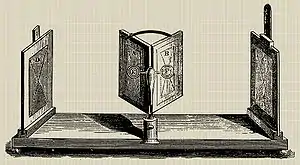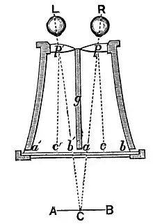 В 1832 году Чарльз Уитстон (англ. Charles Wheatstone) предложил стереоскоп другой конструкции[2]. Его прибор был основан на рассматривании половин стереопары через зеркала, расположенные перед глазами наблюдателя под углом 45°. Друг с другом зеркала образовывали прямой угол и перенаправляли свет от двух рисунков, закреплённых на противоположных боковых стенках стереоскопа. Как и стереоскоп Эллиота, устройство появилось до изобретения фотографии, и служило аттракционом, демонстрирующим возможности бинокулярного зрения воспринимать объём нарисованных соответствующим образом картинок[5].