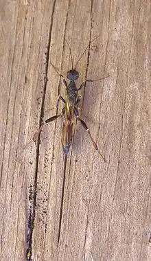 Длина тела от 8 до 17 мм (без яйцеклада). Тело чёрного цвета с желтовато-коричневыми отметинами на брюшке и ногах. На темени развиты зубцы (отсюда видовое название). Задние лапки 5-члениковые. На бёдрах задних ног развиты 2 зубца. Встречается в лесах, редколесьях, кустарниковых зарослях. Самки пробуравливают ствол лиственных деревьев в поисках хозяина, в которых откладывают одно яйцо. Личинки развиваются в жуков-усачей[1][2].