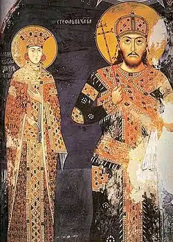 16 апреля 1346 года (на Пасху) Стефан Душан был коронован как «царь Сербов и Греков»[8] (в греческих текстах — «василевс Сербии и Романии»; оба этих слова означали императорский титул)[11]. Коронацию совершил Иоанникий II, за несколько дней до того избранный патриархом Сербским; на церемонии присутствовал и болгарский патриарх Симеон. Впрочем, новый титул не был признан большинством соседей Сербии (Византией в том числе); царём Душана именовали только представители Венеции и Дубровника. Сам Душан, однако, признавал за византийским императором главенство — хотя бы теоретическое; так, в том же 1346 году на переговорах с представителями монастырей Афона он дал согласие на то, что его имя будет поминаться в молитвах лишь после имени императора Византии[12].