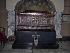 Стефан Душан неожиданно умер 20 декабря 1355 года, во время пребывания на недавно завоеванных византийских областях[15],не прожив и пятидесяти лет. Первоначально он был похоронен в своей задужбине, монастыре Святых Архангелов близ Призрена; в 1615 году церковь была разрушена османами. В 1927 году в ходе археологических раскопок на месте монастыря гробница Стефана Душана была обнаружена, а прах царя был перенесён в Церковь Святого Марка в Белграде.
