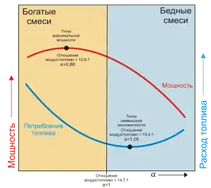 Коэффициент избытка воздуха всегда для стехиометрической смеси равен единице. Но практически в двигателях внутреннего сгорания (ДВС) этот коэффициент отличается от 1. Так например, оптимальный с точки зрения экономичности для двигателей с искровым зажиганием 1,03—1,05, это превышение обусловлено тем, что из-за несовершенства смешения топлива с воздухом в карбюраторе или цилиндре двигателя с впрыском топлива для полного сгорания топлива необходимо небольшое увеличение . С другой стороны, наибольшая мощность двигателя при прочих равных достигается при работе на более богатых смесях (). На рисунке показаны зависимости мощности и экономичности двигателя с искровым зажиганием от и соотношения воздух/топливо для бензина при некоторых значениях . Так, для бензина стехиометрическое соотношение воздух/топливо по массе составляет 14,7, для смеси пропан-бутан это соотношение равно 15,6.