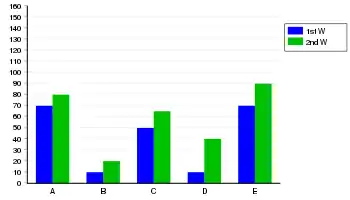 Столбчатые диаграммы также могут использоваться для более сложных сравнений данных. В группированной гистограмме у каждой категории есть два или более сравниваемых свойства, для каждой из которых есть своя зона диаграммы. Зоны, отображающие одни и те же свойства разных категорий, обозначены одним цветом[4].