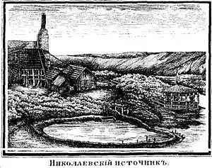 До революции на месте Николаевского источника был оборудован небольшой деревянный сруб в виде колодца цилиндрической формы глубиною до дна около 2-х метров. По данным К. Ивенсена, этот источник давал около 46 килолитров в час, т.е. 1123 килолитра в сутки.