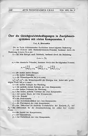- 1. Über die Gleichgewichtsbedingungen in Zweiphasensystemen mit Komponenten. I. Moscou. Acta Physicochimica USSR. Vol. XIII. 1940. No. 4. S. 505—530