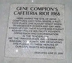 Первые открытые стычки ЛГБТ-людей с полицией были отмечены ещё в 1959 году[26]. В 1966 году полиция прибыла в Кафе Комптона, чтобы арестовать мужчин за ношение одежды противоположного пола. Локальный конфликт очень быстро перерос в открытое противостояние с хозяевами кафе. Друзья арестованных устроили в кафе настоящий погром. В расход шло все: от тарелок и чашек, до зеркал и окон. На следующую ночь, когда хозяева кафе вставили разбитые окна и зеркала, погром повторился с ещё большей силой. Кафе было практически «стёрто с лица земли»[27] И так продолжалось до тех пор, пока арестованных не отпустили. Считается, что этот конфликт ознаменовал собой начало трансгендерного движения в Сан-Франциско[27].