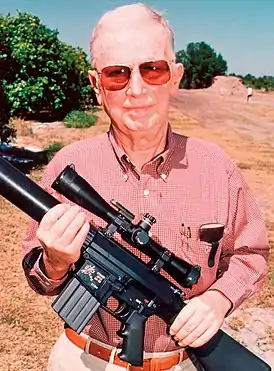 Там же в ArmaLite Стоунер разработал винтовку с прикладом с наполнителем из полиуретановой пены и алюминиево-стальным стволом, которая была легче всех имеющихся армейских винтовок, включая опытные прототипы. Для того, чтобы компенсировать увеличившуюся пропорционально сниженному весу отдачу ствола, Стоунер прибег к созданию более мощного дульного тормоза. На тот момент винтовка была ещё слишком «сырой» и недоработанной, но впоследствии нарекания и недоработки были устранены, она была принята на вооружение под индексом M16[10]. Но произошло это лишь через пять лет после описываемых событий, к тому времени из-за неудачи с постановкой AR-15 на вооружение материнская компания Fairchild продала ArmaLite. Стоунер покинул ArmaLite, какое-то время проработав непосредственно в Fairchild, затем устроился независимым консультантом при компании Colt, которой были проданы права на доводку и продажу AR-15. Делу помог случай: упомянутый генерал Лемей, заехав однажды на стрельбище Fairchild под Хейгерстауном, стал свидетелем заводских испытаний AR-15, был настолько впечатлён увиденным, что распорядился закупить 8,5 тыс. винтовок для ВВС[11].