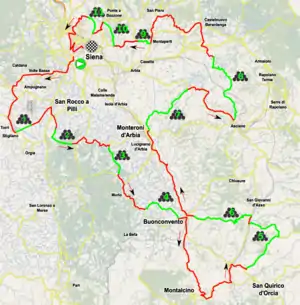 Помимо грунтовой дороги, гонка характеризовалась очень волнистой и неровной трассой, с многочисленными изгибами и первым сложным подъёмом с градиентом близкими к 10% на втором участке грунтовой дороги. Вскоре после сложного подъёма шёл асфальтированный участок в конце которого начинался подъёмом в Монтальчино — 4 км с градиентом 5%. Последний отрезок грунтовой дороги - Тольфе - заканчивался в 12 км от финиша. В 2 км от финишной линии начинался подъём на Порта ди Фонтебранда с градиентом 9% -10% и с максимальным 16% на Виа-ди-Санта-Катерина, в 500 метрах от финиша на Пьяцца-дель-Кампо.