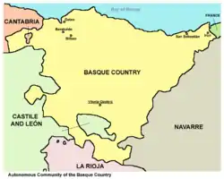 Исторический регион Страна Басков включает в себя также Автономное Сообщество Наварра (столица Памплона) и Северную Страну Басков на юге Франции.