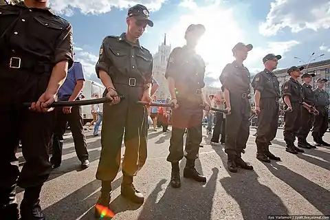 «Те милиционеры, что стояли в оцеплении, вели себя вполне сдержанно, не проявляя агрессии. Когда им приказывали, они просто брались за руки и теснили людей, размазывая их по стенам метро, или сжимали, как прессом, надавливая сзади и спереди. Зато группы задержания работали с огоньком. Они смело бросались в гущу, выхватывали добычу и бегом волокли в автобус.»[64]