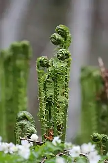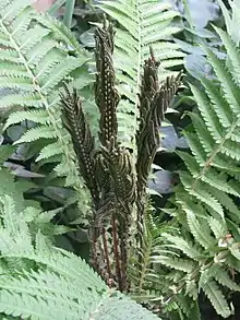 Крупный папоротник с толстым вертикальным корневищем.