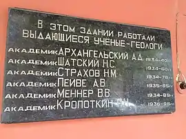 - Имена Н. М. Страхова, А. Д. Архангельского, Н. С. Шатского, А. В. Пейве, В. В. Меннера, П. Н. Кропоткина высечены на мемориальной доске, установленной на фасаде здания Геологического института РАН в 1999 году[10].