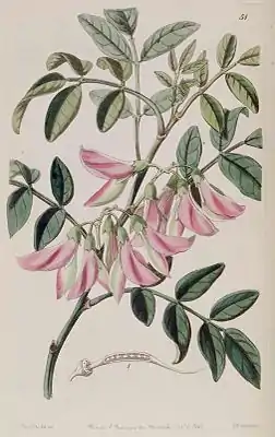 Многолетняя древовидная лиана. Листья перистые. Цветки розово-красные, крупные, до 25 мм длины, собраны в кисть[2].