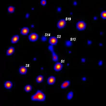 Рассчитаны точные орбиты для ближайших к центру Галактики 28 звёзд, наиболее интересной среди которых является звезда S2. За время наблюдений (1992—2021), она сделала почти два полных оборота вокруг чёрной дыры, что позволило с большой точностью оценить параметры её орбиты. Период обращения S2 составляет 15,8 ± 0,11 года, большая полуось орбиты 0,12495′′ ± 0,00004′′ (1000 а. е.), эксцентриситет 0,88441 ± 0,00006, максимальное приближение к центральному телу 0,014443′′ или 119,54 а. е.[3][10] Орбиты S2 и других звёзд S-скопления (S29, S38, S55) оказались близкими к кеплеровским орбитам, хотя наблюдаются и релятивистские поправки (в частности, шварцшильдовская прямая прецессия орбиты). Ретроградная (ньютоновская) прецессия орбит, которая присутствовала бы при наличии достаточно большой распределённой массы вблизи перицентров, не наблюдается; это означает, что почти вся масса, влияющая на движение звёзд, сосредоточена в центре. Измерения исключают (со значимостью 3σ) существование распределённой массы более 7500 M⊙ внутри орбиты S2[3]. Точное измерение параметров орбит позволило с высокой точностью оценить массу центрального тела. По последним оценкам (2021) она равна