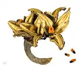 Семена черные с ярким оранжевым ворсистым присемянником.[5][6]