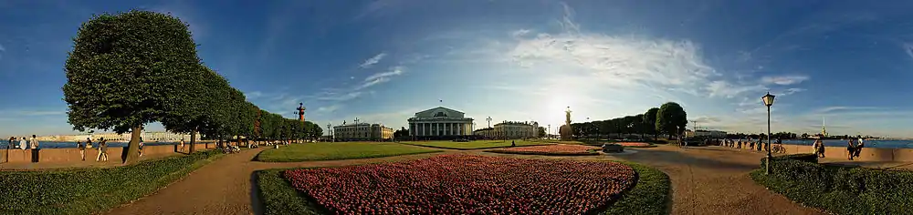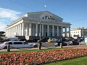 Биржа, или Центральный Военно-морской музей, или Государственный Эрмитаж . Филиал — здание в стиле классицизма построено в 1805—1810 годах по проекту архитектора Ж.-Ф. Тома де Томона. Торжественно открытое в 1816 году, предназначалось для проведения Биржевых собраний для совершения торговых сделок и заседания биржевого комитета. Здание Биржи решено по типу античного храма с дорической колоннадой на высоком гранитном подиуме, к которому ведут широкие лестницы и пологие пандусы. С 1939 году здесь размещается Центральный Военно-морской музей, который в 2012 году переехал в бывшие Крюковы казармы на площади Труда. В 2013 году здание передано Государственному Эрмитажу для приспособления под музейные цели и находится на реконструкции[25], для размещения музея геральдики и русской гвардии[26].