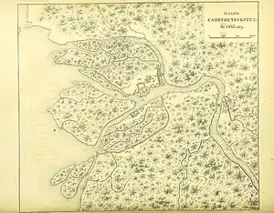 Обозначена батарея, заложенная в 1703 году на стрелке Васильевского острова