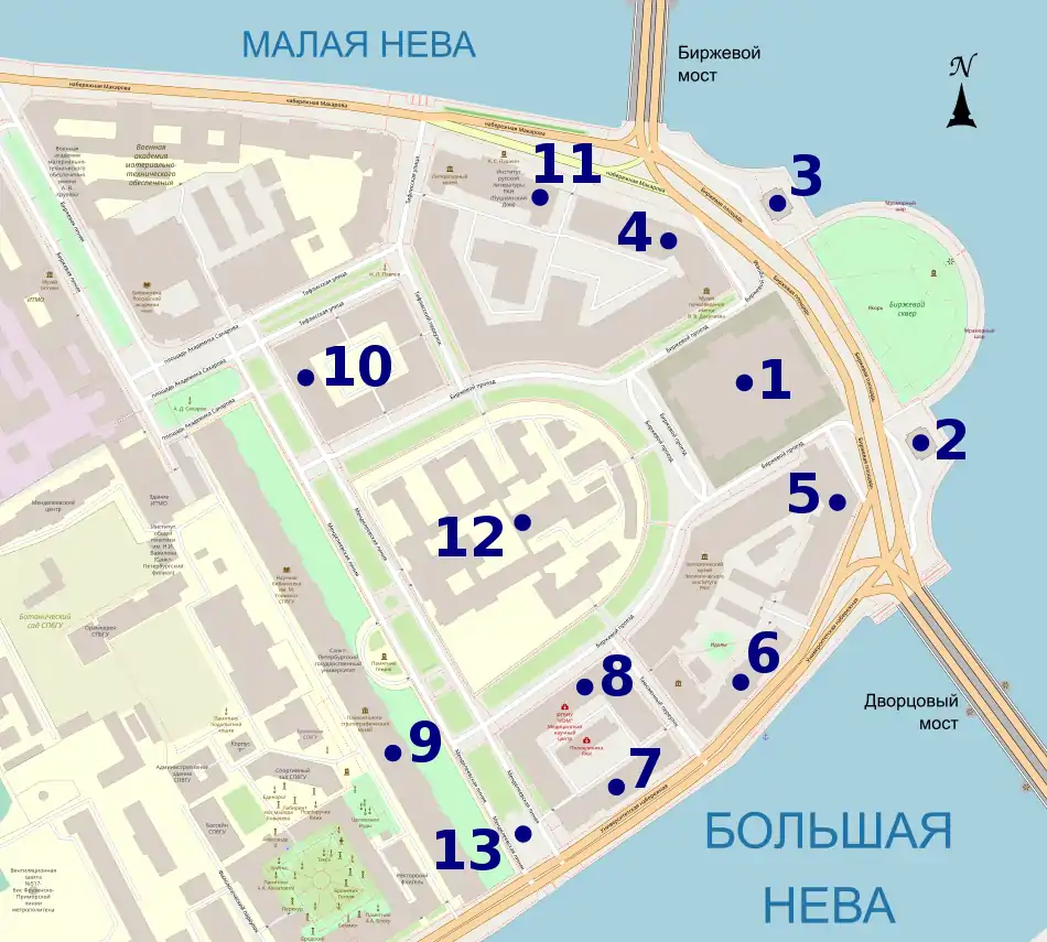 Новобиржевой гостиный двор, или Ленинградский университет, или Санкт-Петербургский государственный университет. Построено в классическом стиле в 1800—1815 годах по проекту архитектора Д. Кваренги как склады товаров. Двухэтажное здание в виде замкнутого четырехугольника с большим внутренним двором. Нижний этаж представляет собой открытую аркаду, образующую обходную галерею. Окна второго этажа обрамлены полуциркульными наличниками. Стены обработаны рустом, завершены карнизом. На втором этаже были устроены открытые галереи, обращенные в сторону двора. В 1917—1937 годах помещения занимали склады милиции. В 1936 году по проекту архитекторов Я. Я. Кетчера и В. И. Пилявского надстроен 3-й этаж. С 1934 года здание занимает Санкт-Петербургский государственный университет: исторический и философский факультеты, и Медицинский колледж СПбГУ[34].