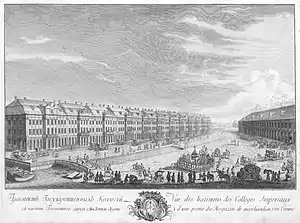 Здание Двенадцати коллегий, или Императорский университет, или Санкт-Петербургский государственный университет. Здание в стиле барокко возведено в 1722—1736 годах по проекту архитектора Д. Трезини. Построено для размещения Сената, Синода и десяти министерств (коллегий: «коллегия иностранных дел», «мануфактур-коллегия», «военная коллегия», «адмиралтейская коллегия», «юстиц-коллегия», «коммерц-коллегия», «берг-коллегия», штатс-контор-коллегия, «камер-коллегия», «ревизион-коллегия», «вотчинная коллегия», «главный магистрат»). Выстроено из двенадцати однотипных корпусов, вплотную приставленных друг к другу и обращенных к Неве узким торцевым фасадом. После реформирования коллегий в 1806 году здание передали Главному педагогическому институту, а в 1819 году — вновь созданному Петербургскому университету. Сейчас здесь размещается Санкт-Петербургский государственный университет (в советское время — Ленинградский Государственный университет им. А. А. Жданова): Ректорат и Биологический факультет[33].