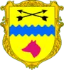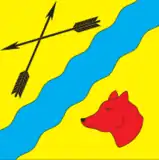 На золотистом поле синяя волнистая полоса, над ней две перекрещенные стрелы направленные остриями вверх, под ней голова лисицы.