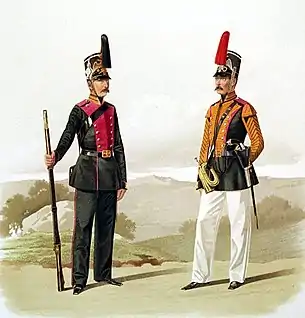 - Илл. 224. Рядовой и Горнист Л.-Гв. 1-го и 2-го Стрелковых батальонов. (В парадной форме) 31 Марта 1856. // Перемены в обмундировании и вооружении войск Российской Императорской армии с восшествия на престол Государя Императора Александра Николаевича (с дополнениями) : Составлено по Высочайшему повелению / Сост. Александр II (император российский), илл. Балашов Петр Иванович и Пиратский Карл Карлович. — СПб.: Военная типография, 1857—1881. — Тетради 1—111 : (С рисунками № 1—661). — 47×35 см.