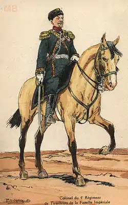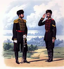 - Илл. 471. Штаб-Офицер и Унтер-Офицер Л.Гв. Стрелкового батальона Императорской Фамилии. (Городская праздничная форма). 10 Июля 1867 // Перемены в обмундировании и вооружении войск Российской Императорской армии с восшествия на престол Государя Императора Александра Николаевича (с дополнениями) : Составлено по Высочайшему повелению / Сост. Александр II (император российский), илл. Балашов Петр Иванович и Пиратский Карл Карлович. — СПб.: Военная типография, 1857—1881. — Тетради 1—111 : (С рисунками № 1—661). — 47×35 см.
