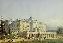 В конце XVIII века Стрельна стала частным великокняжеским владением — в 1797 году Павел I подарил её своему второму сыну — великому князю Константину Павловичу, благодаря чему большой дворец и парк получили название, сохранившееся до сих пор. Архитектурная доминанта комплекса — Константиновский дворец — начал строиться по проекту Н.Микетти в 1720 году. В 1750-х годах он был достроен архитектором Б. Растрелли, а после пожара 1803 года восстанавливался с изменениями, внесёнными А. Н. Воронихиным и Л. Руска, обновлялся в 1847—1851 годах Х. Ф. Мейером, А. И. Штакеншнейдером и А. Н. Брюлловым.